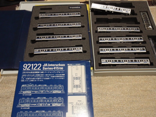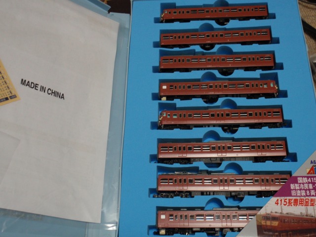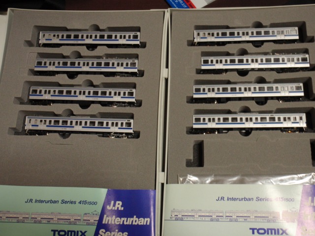 全てTOMIXになります。 右上:92721 415系4両基本Bセット 右下:92223 415系1500番台4両増結セット(現行ロット) 右:92054 415系1500番台4両増結セット(2次ロット) 92209 415系旧塗装4両基本セット 右上:92223 415系クハ411-1600番台セットバラシ 右下:92032 415系1500番台4両基本線っと(初期ロット) 左下:92122 415系700番台バージョンアップセット 92032、92033は20年前に購入したもの。 <おまけ> MicroAceの415系旧塗装8両セット ということで、 旧塗装:4両×3本 新塗装:7両×1本、4両×1本(+3両) 1500番:4両×5本 の46両となり、 当車両センターで最大派閥であるE231系(常磐色)の50両に続く、 第2の派閥系統となりました・・・(^^; 室内灯どうしよう・・・、追加注文分で足りるかな(汗) | カレンダー