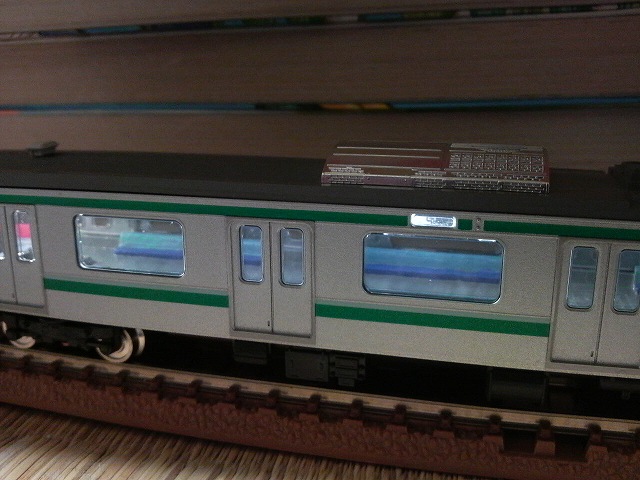 いつものように室内塗装も実施。 ネットで床板と座席の色をチェックしたところ、 座席が2色(背もたれ:エメラルドグリーン、腰掛け:ブルー)だったことに驚き。 ・・・そうだったっけ? で、優先席はグレーとマルーン。 床ははグレー。 前回E231系のとき、床色が若干濃い感じがしたので、 ちょっと薄目にしたんですが、 あまりノーマルと変わらないので、結局ダークグレーで。 ところが問題発生。 優先席の着色中、背もたれと腰掛けを逆に塗装。 修正するも、逆に悪化し、 やむえずサーフェーサの刑。 しかし1両完成させるのに 丸2日もかかってしまった。 ちょっとエメラルドが強いかな・・・。 しかし、白帯が弱いね・・・。 緑帯の上に白を着色してるんだもん・・・Tomixさん。